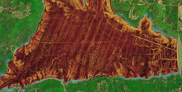 Relief shading gives boaters high-resolution imagery of lake and coastal waters for a clear view of changes in depth that can reveal the underwater landscape. Color and shadow represent different depths, with shallower waters appearing red transitioning to deepest waters appearing dark blue and purple.