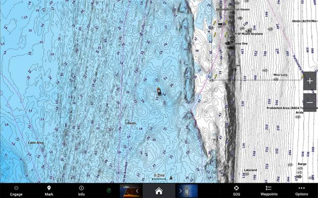 When looking at the fishing map, you’ll see detailed bottom contour lines. Each line represents depth level, which is great for identifying fish structure (like points, humps and drop-offs) and knowing when you’re approaching shallow waters.