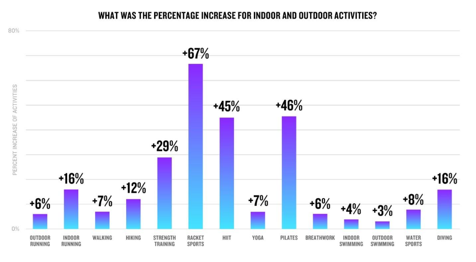 Sau đó là sự tăng trưởng của Pilates và HIIT, cùng với lặn (+16%), đi bộ và yoga (cùng +7%). Các môn thể thao mùa đông tăng 8%, bài tập hít thở (breathwork) tăng 6%, và bơi lội tiếp tục duy trì đà tăng cả trong nhà lẫn ngoài trời.