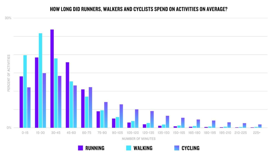 Chạy bộ tiếp tục khẳng định sức hút mạnh mẽ. Chạy ngoài trời tăng 6%, với Nhật Bản dẫn đầu, trong khi chạy trong nhà tăng 16%, nổi bật nhất là người dùng tại Na Uy. Nam giới chạy ngoài trời nhiều hơn 21%, trong khi phụ nữ lại chiếm ưu thế với  chạy trong nhà với mức tăng 16%.